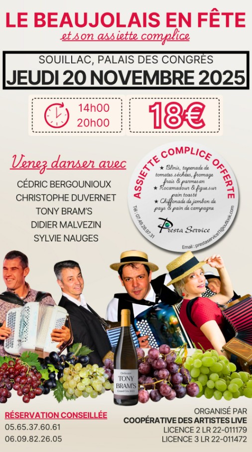 Un après-midi placé sous le signe de la convivialité et de la musique.L’orchestre Tony Bram’s VIP, mené par le célèbre trompettiste Tony Bram’s, fera danser le public au rythme du musette et de la variété.Les participants auront également le plaisir de déguster les vins primeurs, notamment le Beaujolais Nouveau et le Gaillac, accompagnés d’une assiette gourmande concoctée par Presta Service.Ambiance assurée avec les accordéonistes Sylvie Nauges, Cédric Bergounioux, Christophe Duvernet et Didier MalvezinRéservation conseillée