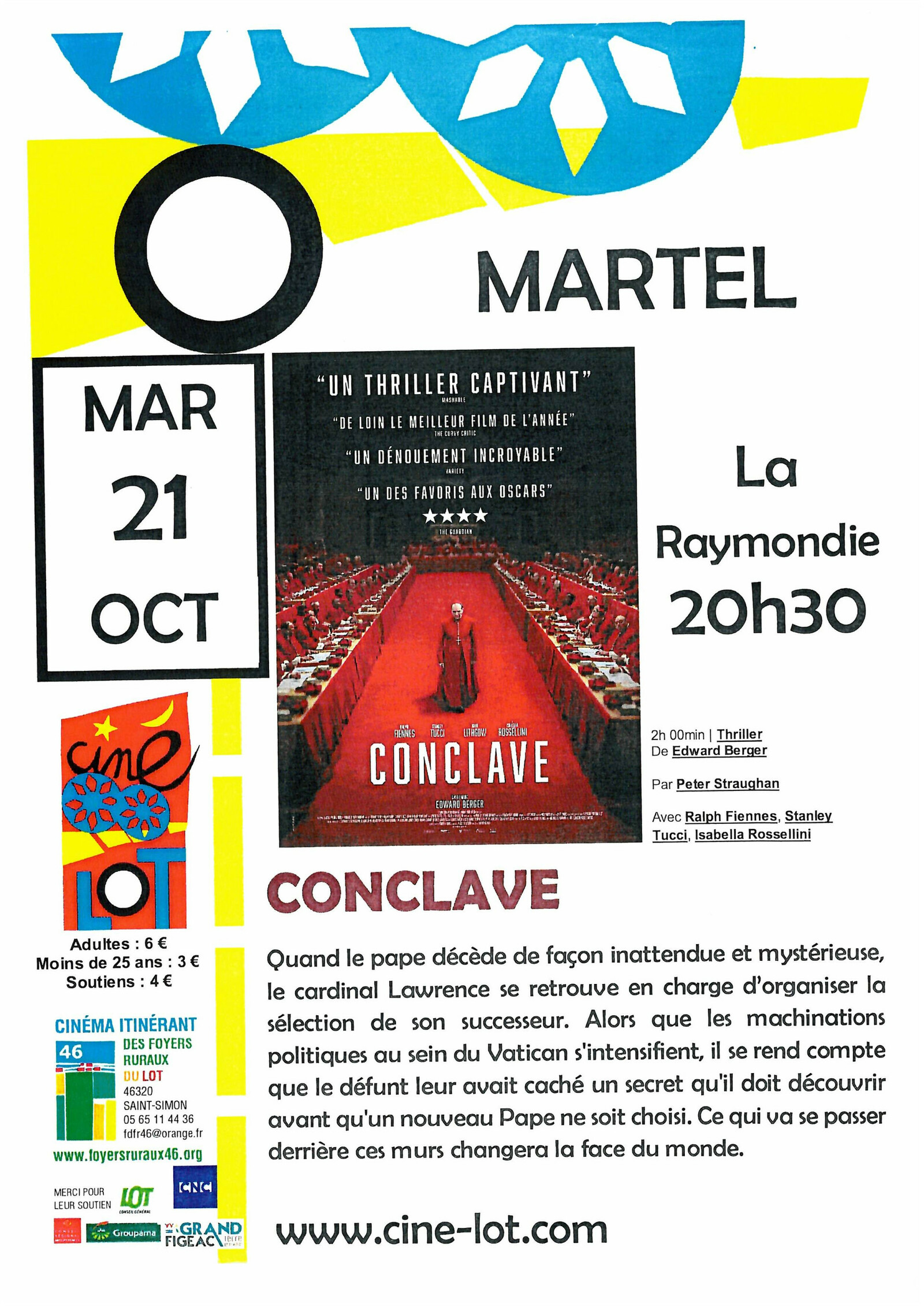 Quand le pape décède de façon inattendue et mystérieuse, le cardinal Lawrence se retrouve à devoir organiser la sélection de son successeur mais non sans difficultés. En effet, le défunt à laissé derrière lui un secret que Lawrence devra absolument percer à jour avant la nomination du nouveau pape.Projection au palais de la Raymondie.