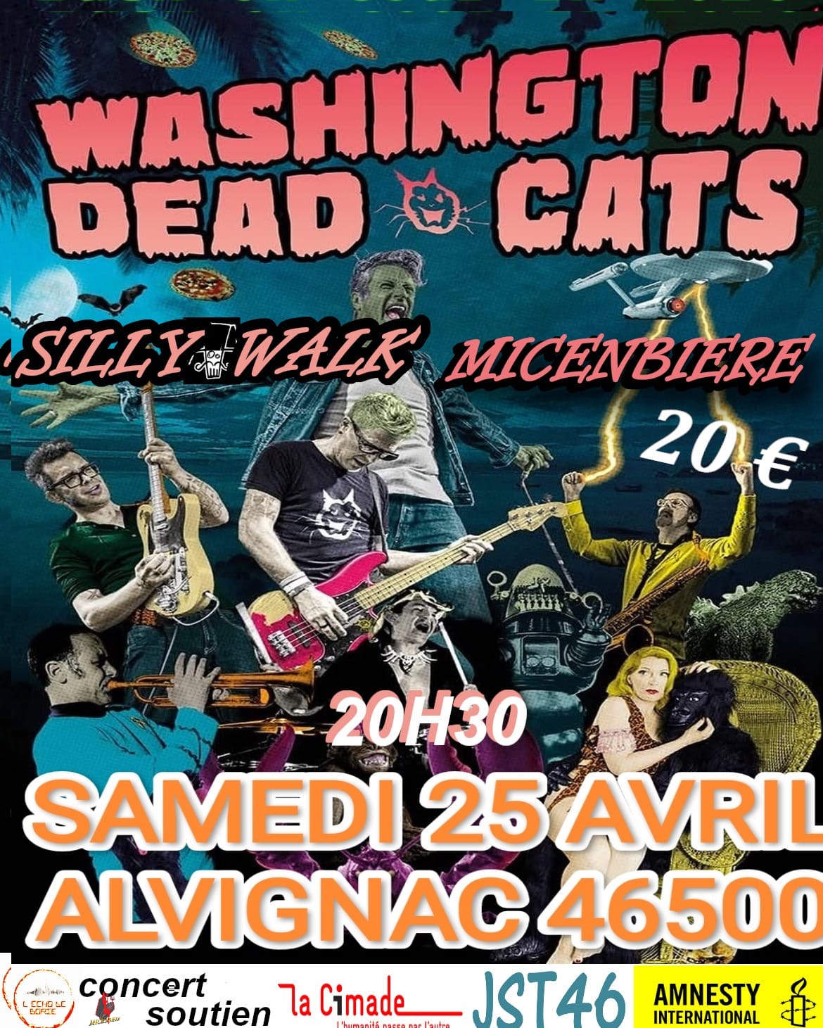 Concert événement des Washington Dead Cats, connu pour leur rock'n'roll punk - " 40 years of punkabilly madness ! " avec en première partie les groupes Silly Walk et Micenbière. Soirée organisée en soutien à La Cimade et JST 46 Réservations via helloasso.comAccueil du public dès 19h30