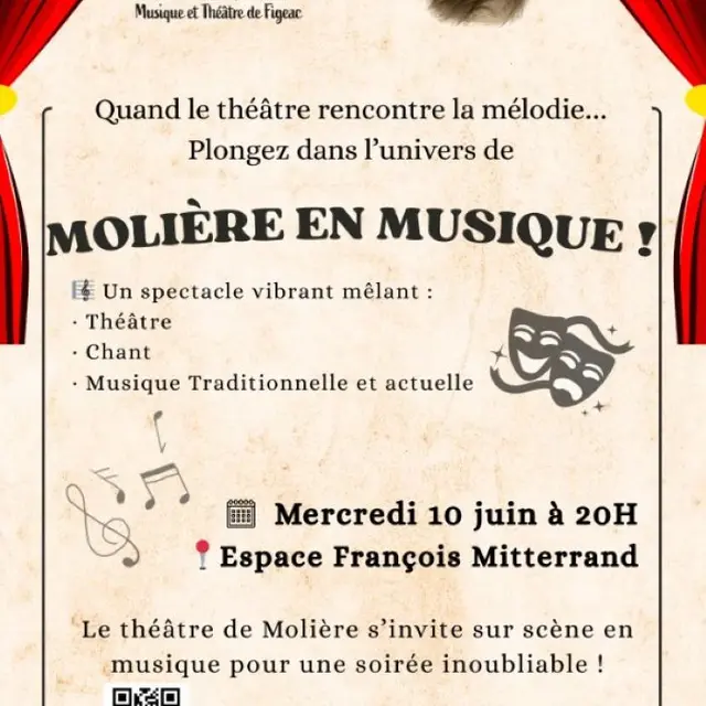 Quand le théâtre rencontre la mélodie… Plongez dans l’univers de Molière en Musique ! Un spectacle vibrant mêlant : Théâtre, Chant, Musique traditionnelle et actuelle. Le théâtre de Molière s’invite sur scène en Musique le mercredi 10 juin à 20h à l’Espace François Mitterrand pour une soirée inoubliable.