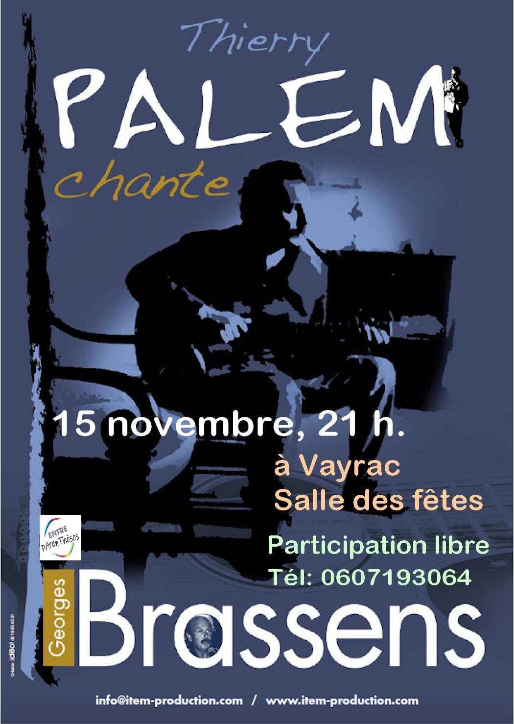 Thierry Palem et sa guitare qui jazze vous emmènera à la redécouverte de Georges Brassens. Reconnu comme l'un des meilleurs interprètes de Brassens, il vous invite, dans une interprétation très personnelle, à retrouver les plus belles chansons de Brassens : chansons inédites, chansons oubliées et chansons les plus connues reprises en chœur par le public.Spectacle adapté aux anciens comme aux plus jeunes