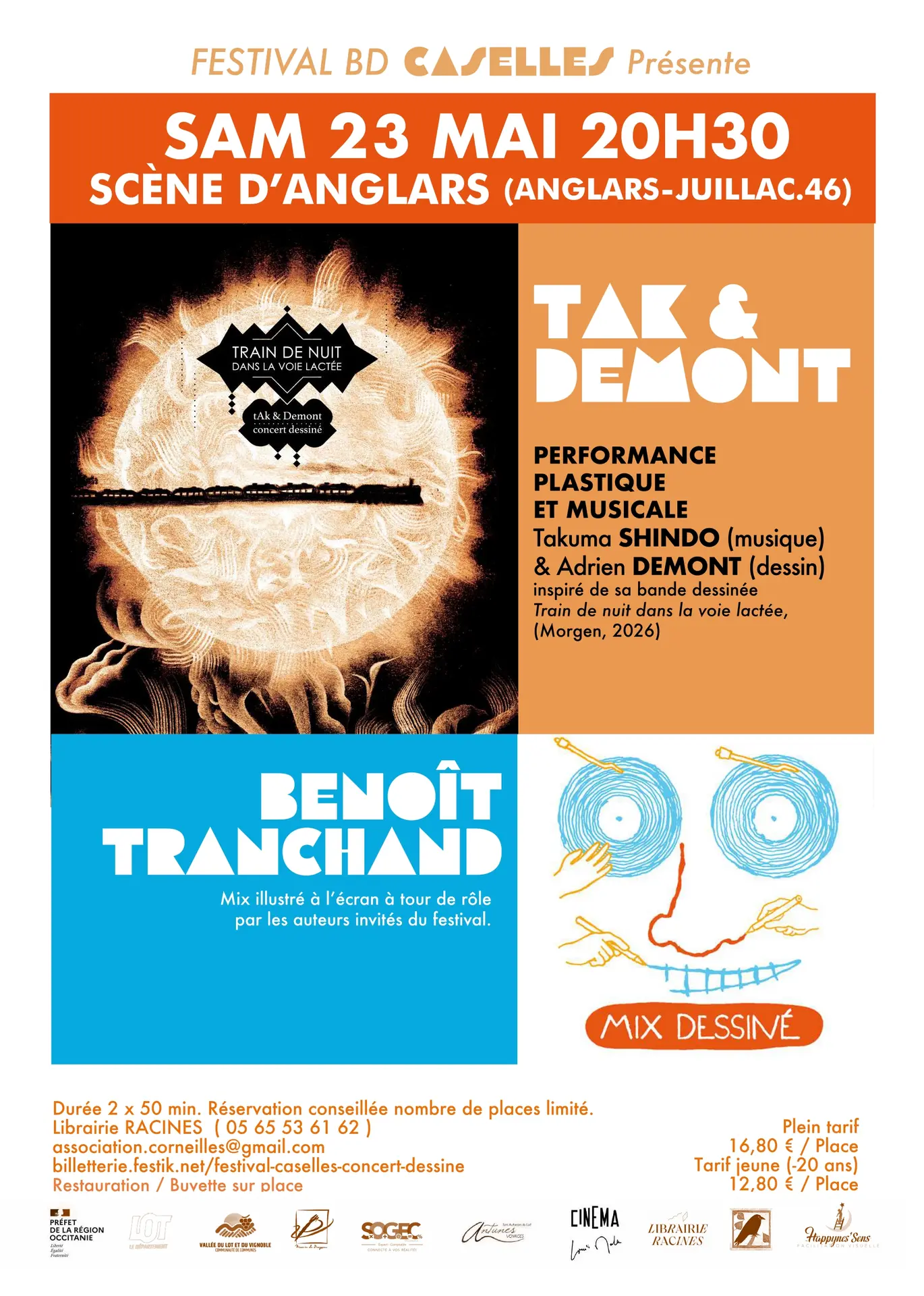 - à 20h30, un spectacle en deux parties : Murmurations, un concert dessiné de Tak et Demont, suivi d'un mix dessiné : spectacle d'improvisation dessinée sur musique rythmée et dansante.
