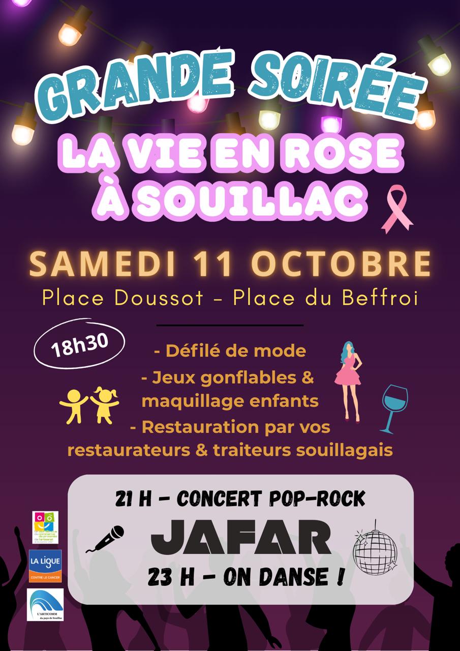 Une grande soirée festive et solidaire au cœur de Souillac avec animations pour petits et grands, concerts et restauration sur place. L’événement s’inscrit dans la lutte contre le cancer du sein et mobilise les acteurs locaux pour une soirée conviviale et engagée- 18h30 : Défilé de mode- Jeux gonflables et maquillage enfants- Restauration par les restaurateurs et traiteurs souillagais- 21h : Concert pop-rock du groupe Jafar- 23h : Soirée dansante