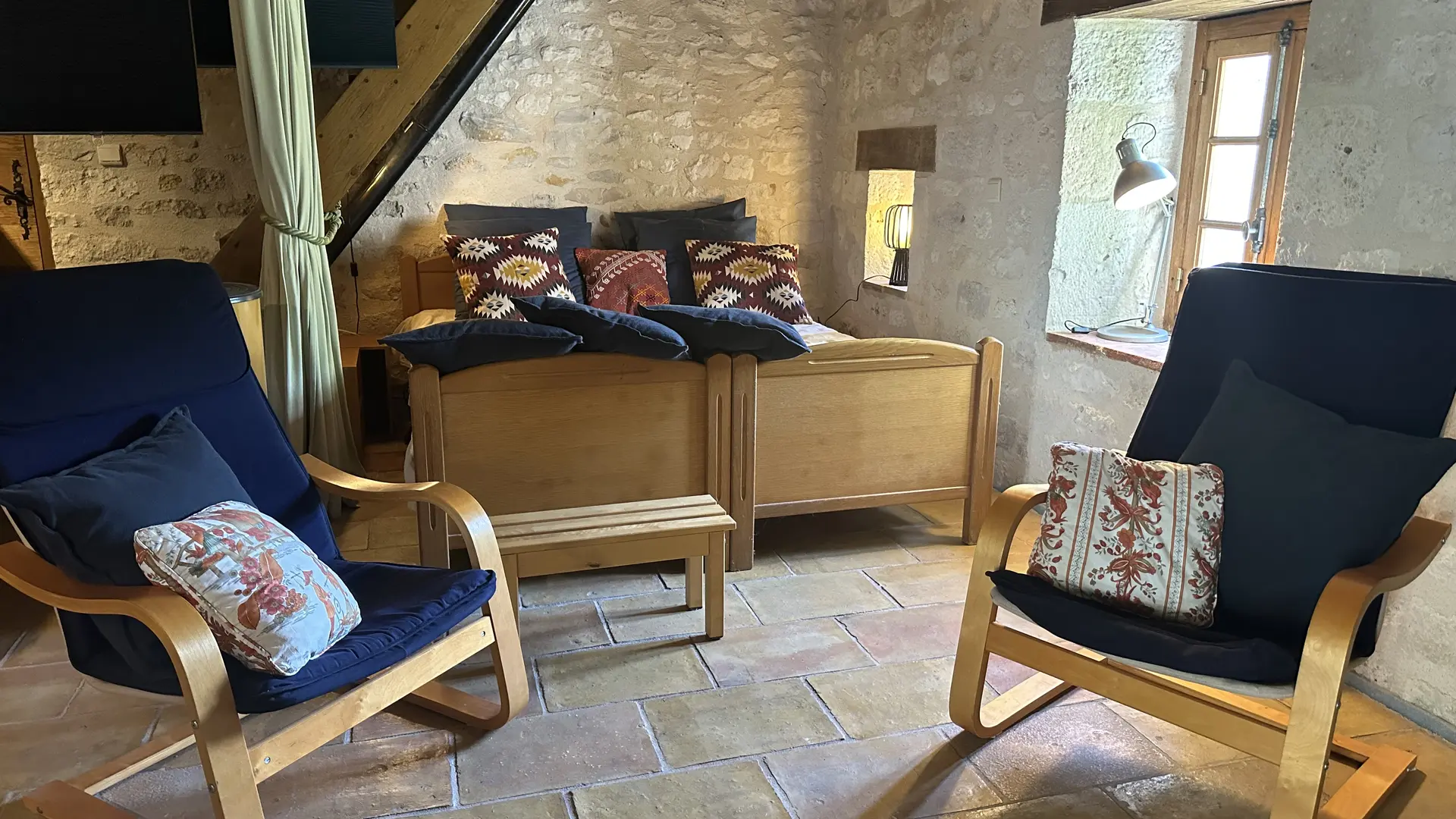 La «Maison Escalier» se compose de deux étages reliés par un escalier extérieur en pierres et un escalier intérieur en bois. La piscine de 5 x 10 m est disponible pour les locataires.Fabre Vieux est un manoir de 1642 en pierre, restauré, situé au cœur du Quercy Blanc, qui accueille des vacanciers et organise les activités artistiques. Il est possible de louer un gîte séparément, ainsi que le 'pricacy' est garanti. On peut aussi louer les 3 gites simultanés: le total est adapté aux grandes familles ou aux couples d'amis jusqu’à 16 personnes qui souhaitent passer les vacances ensemble. Maison Escalier :Rez-de-chaussée : grande pièce de 50 m² avec une table a manger et une cuisine de 12 m² bien équipée : cuisinière avec 5 feux et four au gaz, lave vaisselle, frigidaire, congélateur, lave linge, cafetière, micro-ondes. Il y a un coin chambre, séparée par des rideaux, avec 2 lits de 0,90 = 1.80m x 2m, aussi possible comme 1 lits-jumeaux.Salle de bain avec douche de 1.20 m, lavabo et WC. Etage de 50 m²: le salon devant la grande cheminée ancienne et l'évier en pierre; armoires antiques, coin de chambre de 20 m² avec 2 lits x 0,90=1.80 qui sont posé comme 1 lits-jumeaux, soit comme 2 lits singles; il y a la possibilité d’ajouter un lit single. La maison possède sa terrasse privée avec une table a manger et un coin jardin avec chaises soleils. La psicine de 10 x 5m se trouve a 100 m. distance avec cloiture securisé et terrasse avec 8 chaisses longues et parasols.