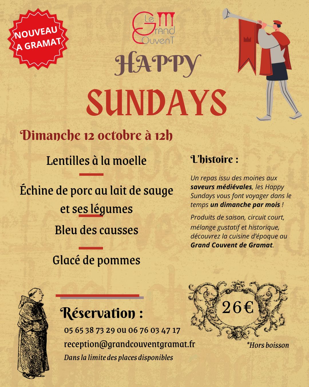 Au restaurant du Grand Couvent, pour célébrer l'histoire, profitez d'un Happy Sundays (menu monastique médiéval) conté en tenue d'époqueSur réservation