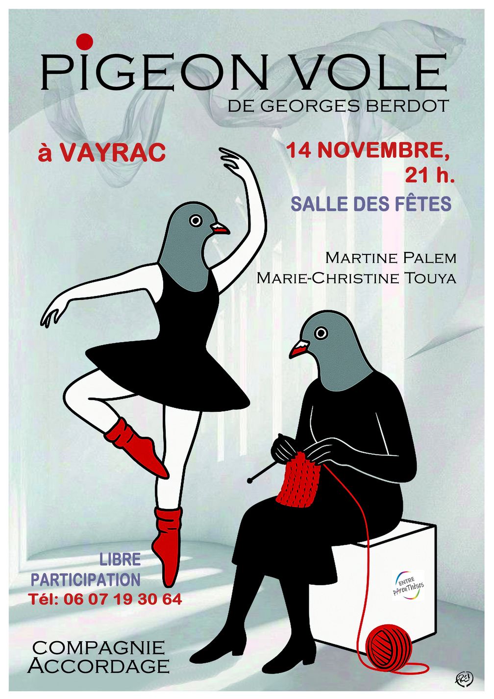 Pigeon vole est une comédie composée de huit tableaux, ciselés dans l'humour noir de femmes blessées par la vie. Elles disent des horreurs, ne s'écoutent pas... mais finissent par nous attendrir : si derrière ces personnages se dissimulaient des êtres de chair et de nerfs, prompts à vaciller dans une douce folie si on leur donnait une parole ouverte ? Elles parlent sans contrainte, et nous font beaucoup rire, parfois avec un pincement au coeur.Pièce de Georges Berdot, avec Martine Palem et Marie Christine Touya, de la compagnie Accordage