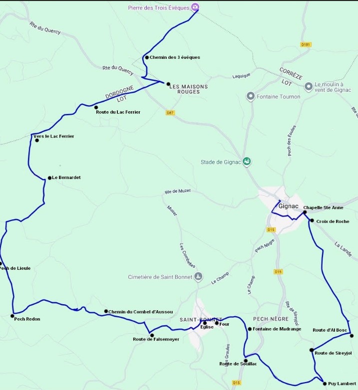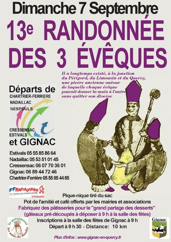 Randonnée conviviale à la découverte du lieu symbolique de jonction entre le Périgord, le Limousin et le Quercy, où trois évêques pouvaient jadis se saluer sans quitter leur diocèse. Le parcours relie plusieurs villagesDéparts organisés depuis plusieurs villages (Gignac, Estivals, Cressensac, Nespouls, Nadaillac, Chartrier-Ferrière)- Inscriptions à Gignac dès 9h- Distance : 10 km- Pot de l’amitié et café offerts- Pique-nique tiré du sac- Grand partage des desserts à la salle des fêtes (pâtisseries à déposer à 9h)Contact- Estivals : 05 55 85 86 64- Nadaillac : 05 53 51 01 45- Nespouls : non précisé- Cressensac : 06 07 70 36 01- Gignac : 06 89 44 72 46- Chartrier-Ferrière : 05 55 85 44 85