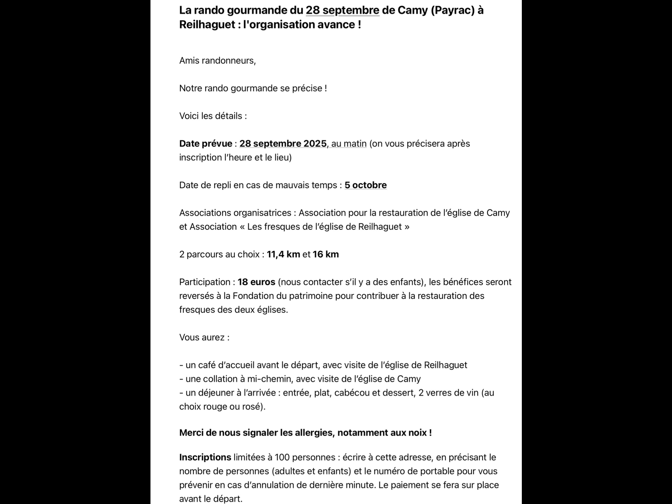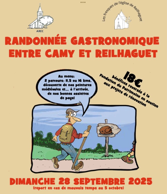 Randonnée pédestre gourmande à travers les paysages entre Camy et Reilhaguet. Deux parcours sont proposés avec une halte culturelle pour découvrir les fresques médiévales locales. À l'arrivée, les participants partagent une assiette du terroirBénéfices reversés à la Fondation du PatrimoineInscriptions par mail : randopayrac@gmail.comReport en cas de mauvais temps au dimanche 5 octobre 2025Départ de l'église de Reilhaguet- Parcours au choix : 11,5 km ou 16 km- Découverte de fresques médiévales- Repas du terroir à l’arrivée