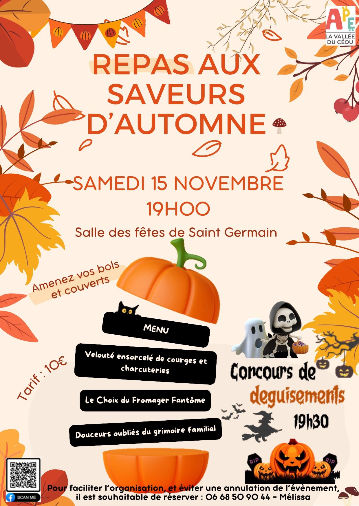 Soirée d’automne et Halloween !L’APE Vallée du Céou vous invite à un repas aux saveurs d’automne, avec soupe chaude, concours de déguisements et ambiance conviviale !Ouvert à tous, petits et grands ! Venez nombreux !19h30 : concours de déguisementsMenu : velouté ensorcelé de courges et charcuteries, le choix du fromager fantôme et douceurs oubliées du grimoire familial. Amenez vos bols et couverts. Réservation conseillée.