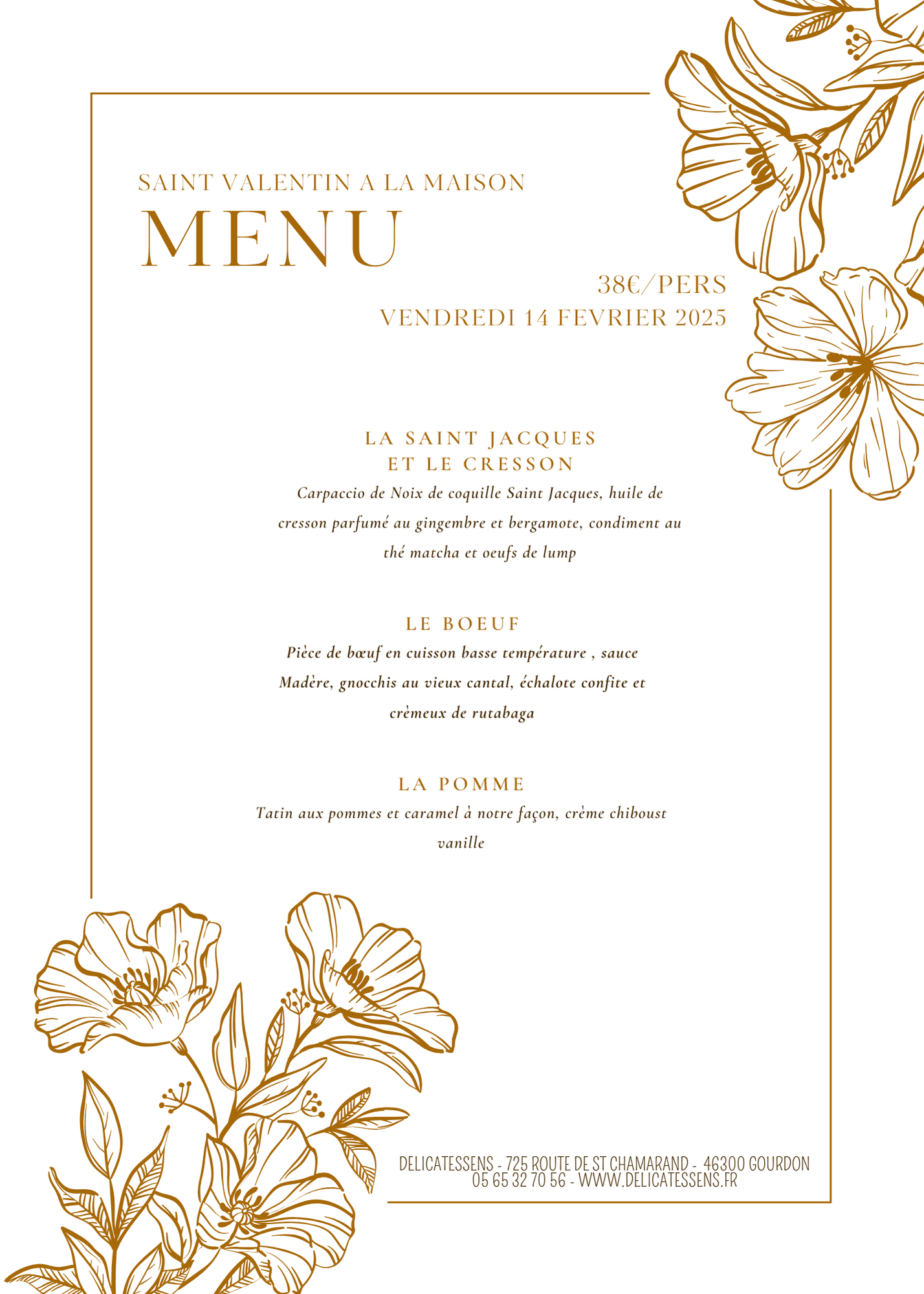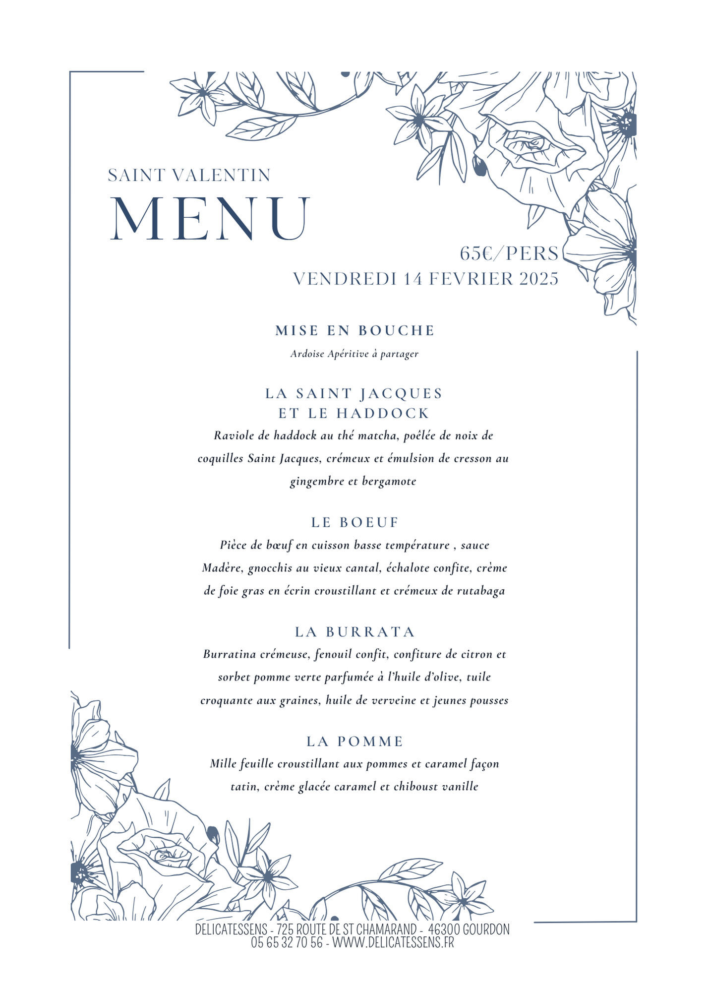 Le restaurant Delicatessens propose deux menus spécial Saint-Valentin : un menu déjeuner léger et un menu dîner raffiné, concoctés pour célébrer l'amour avec des saveurs gourmandes et une atmosphère romantique.Menu Déjeuner- Mise en bouche :Saveurs du moment- La Saint-Jacques et le Haddock :Raviole de haddock au thé matcha, poêlée de noix de coquille Saint Jacques, crémeux et émulsion de cresson au gingembre et bergamoteLe bœuf :- Pièce de boeuf en cuisson basse température, sauce Madère, gnocchis au vieux Cantal, échalote confite, crème de foie gras en écrin croustillant et crémeux de rutabaga- La pomme : Mille feuilles croustillant aux pommes et caramel façon Tatin, crème glacée caramel et chiboust vanille.Menu Dîner | COMPLET |- Mise en bouche :Ardoise apéritive à partager - La Saint-Jacques et le Haddock Raviole de haddock au thé matcha, poêlée de noix de coquille Saint Jacques, crémeux et émulsion de cresson au gingembre et bergamote- Le boeuf : Pièce de boeuf en cuisson basse température, sauce Madère, gnocchis au vieux Cantal, échalote confite, crème de foie gras en écrin croustillant et crémeux de rutabaga- La burrata : Burrata crémeuse, fenouil confit, confiture de citron et sorbet pomme verte parfumée à l'huile d'olive, tuile croquante aux graines, huile de verveine et jeunes pousses.- La pomme : Mille feuilles croustillant aux pommes et caramel façon Tatin, crème glacée caramel et chiboust vanille.Possibilité d'un menu à emporter