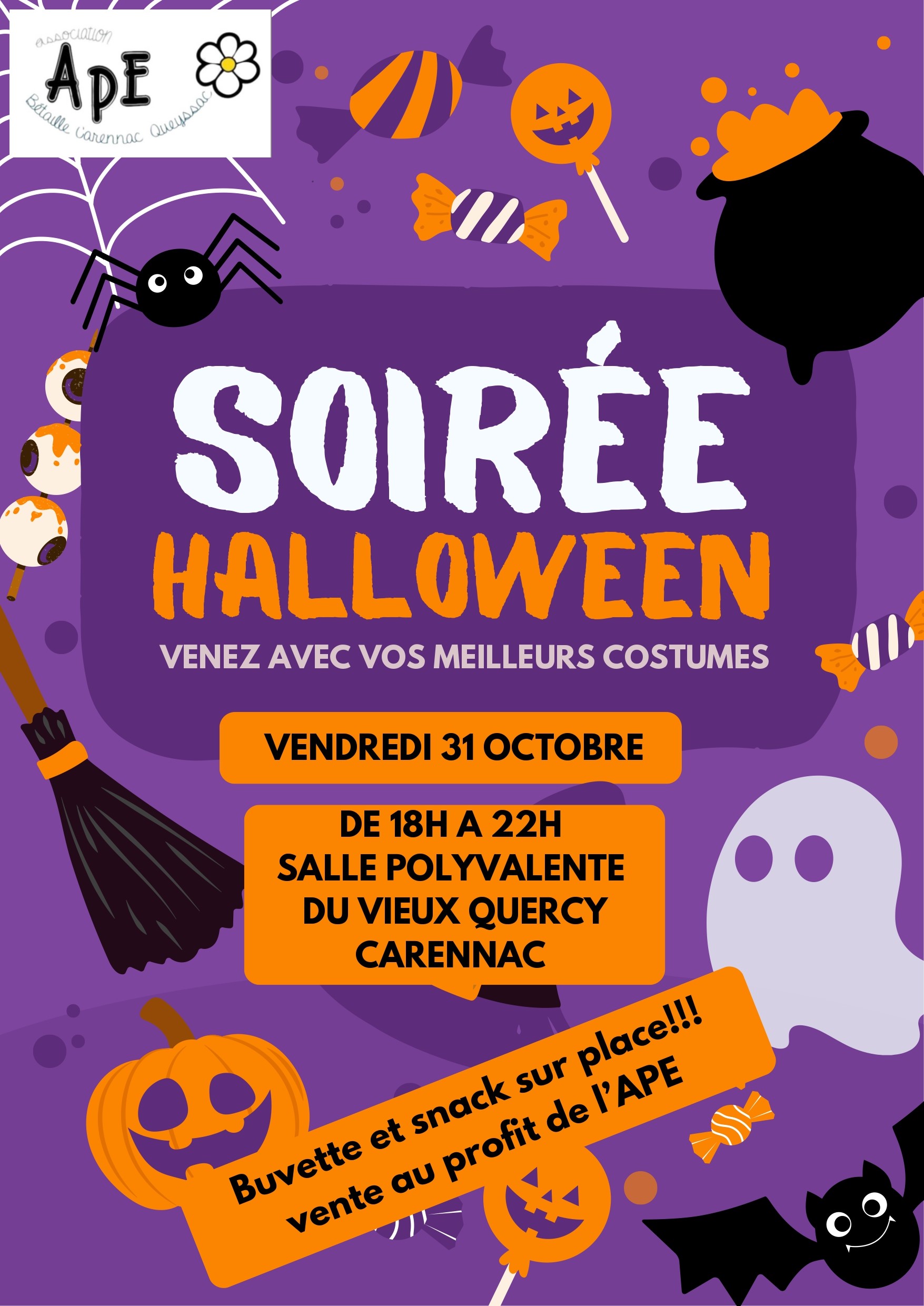 L'association des parents d'élèves organise une soirée conviviale sur le thème d'Halloween à la salle polyvalente du Vieux Quercy. Petits et grands sont invités à venir déguisés pour célébrer la fête dans une ambiance festive et familialeBuvette et snacks payants, au profit de l’APE