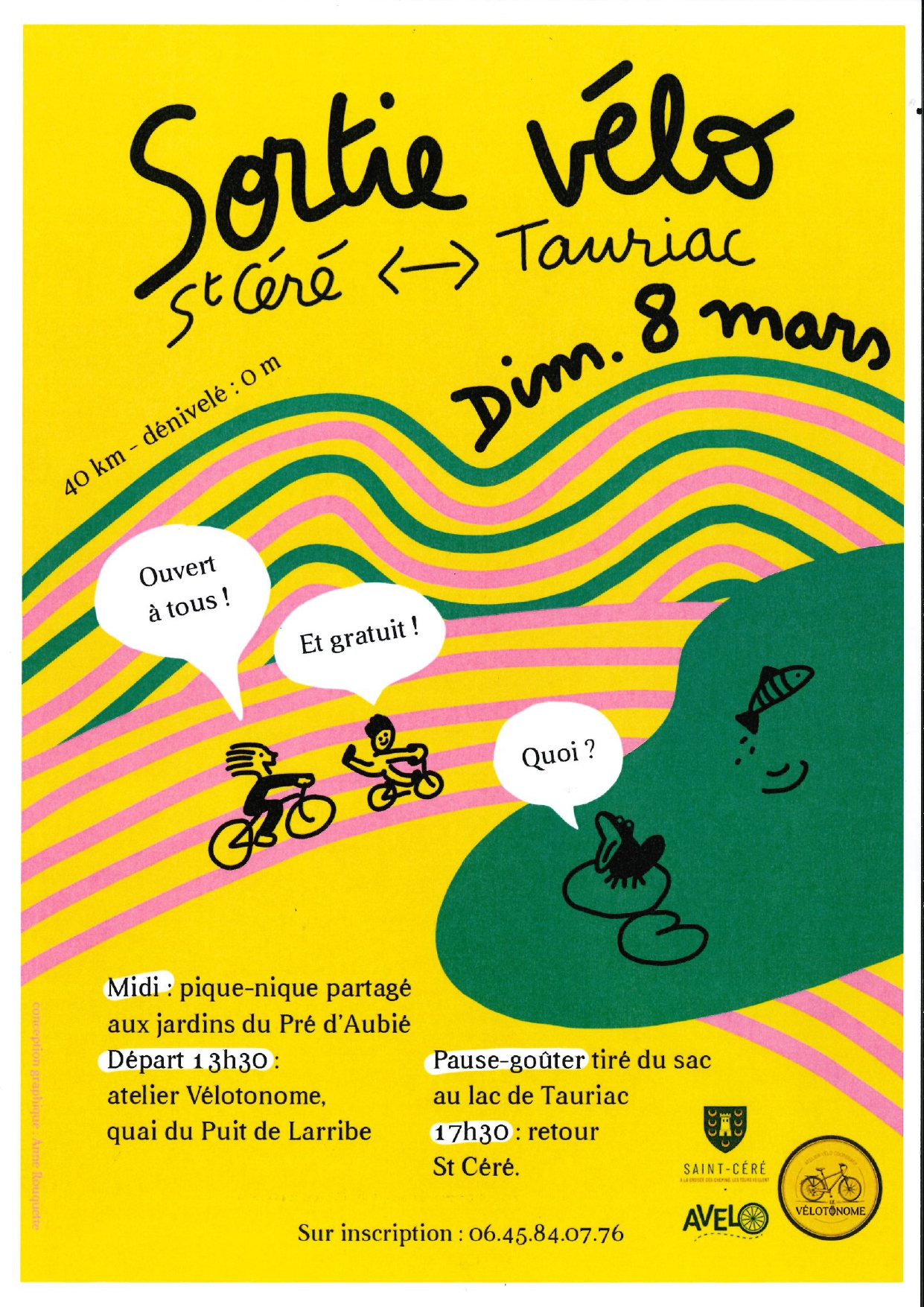 Un après-midi convivial autour du vélo, organisé par Vélotonome. La journée commence par un pique-nique partagé aux jardins du Pré d'Aubié, suivie de la sortie vélo de 40km, puis d’une pause-goûter tiré du sac au Lac de Tauriac