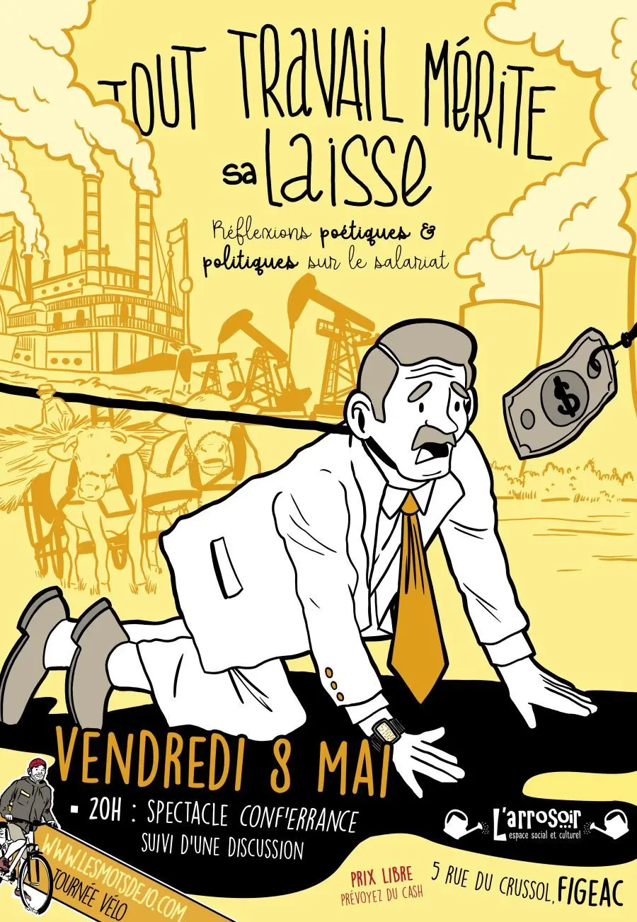 À la suite de la conférence, Mojo anime un cercle de discussion autour de la thématique du travail pour se mettre en action collectivement, comprendre les réalités multiples et instaurer un dialogue pour s’émanciper petit à petit. Il est tout à fait possible de participer à la discussion sans avoir assisté au spectacle.