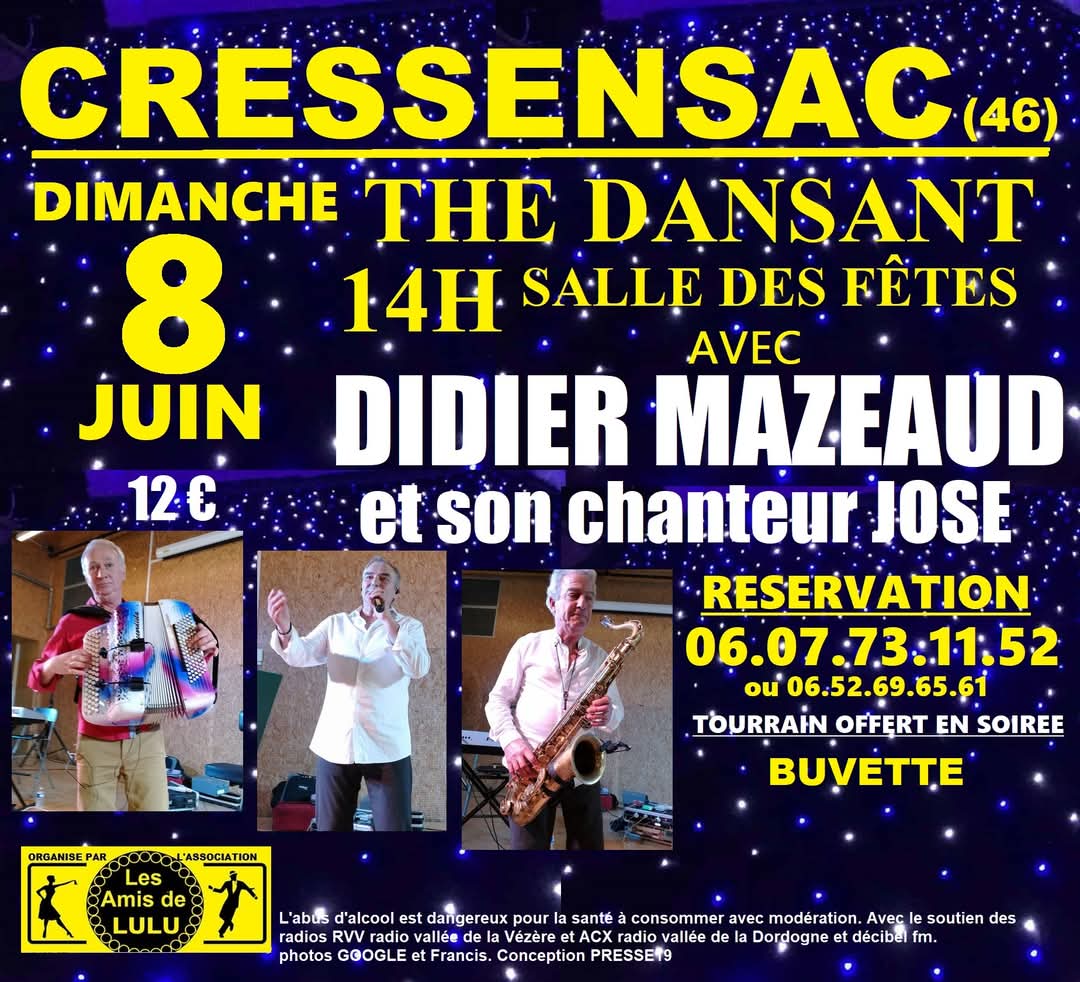 Après-midi festif avec animation musicale par Didier Mazeaud et son chanteur José. Une ambiance conviviale autour de la danse traditionnelle musette est proposée dans la salle des fêtes- 14h : Ouverture de la salle- Animation musicale par Didier Mazeaud- En soirée : tourrain offert