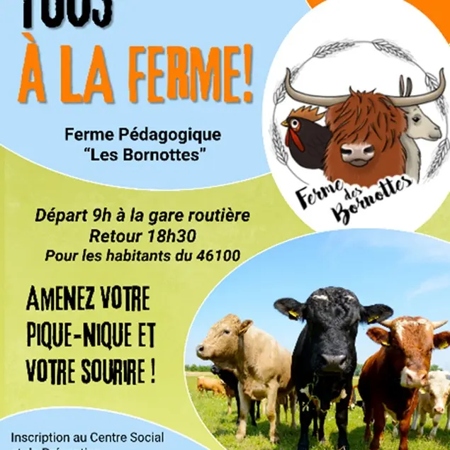 Sortie en famille à la ferme pédagogique Les Bornottes. Les participants découvrent l’univers de la ferme, les animaux et le fonctionnement d’une exploitation agricole dans un cadre convivial. Une journée de découverte et de loisirs accessible aux habitants du secteur de Figeac. Prévoir le pique-nique pour la journée.