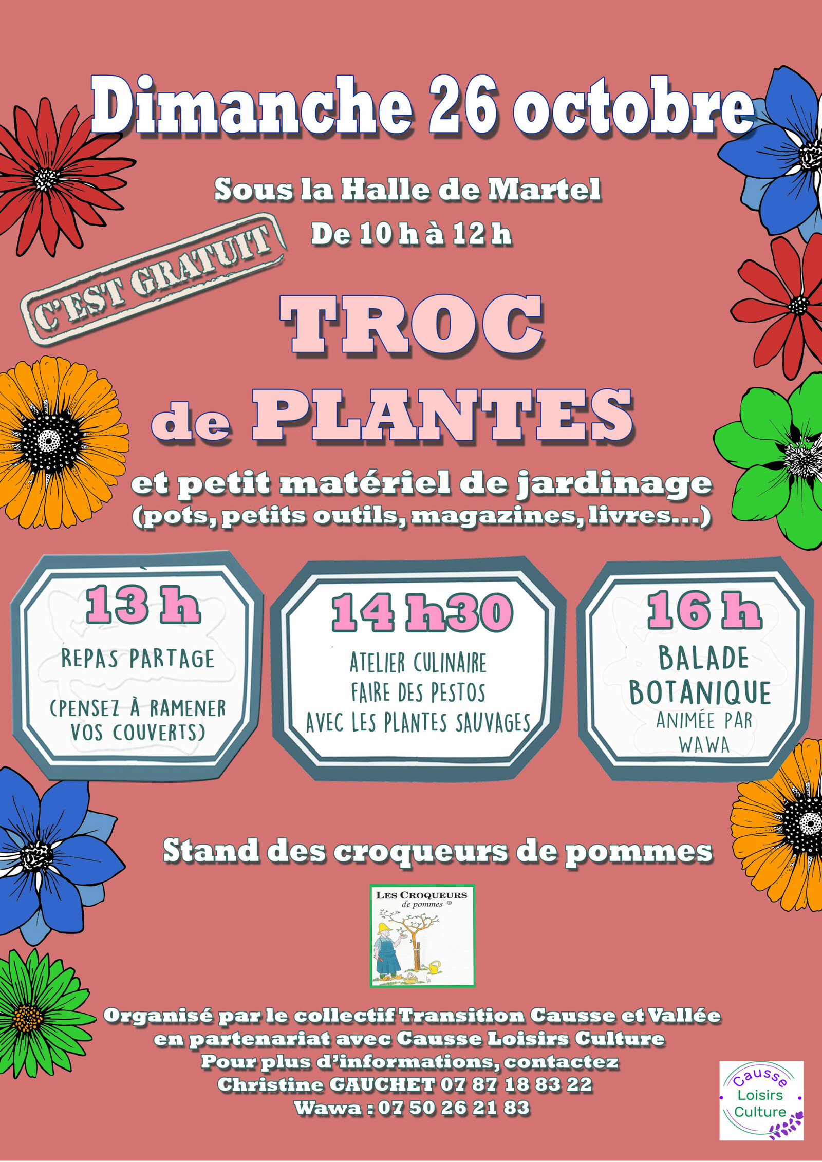 Venez échanger plantes, boutures, graines et petits outils de jardinage dans une ambiance conviviale sous la halle de Martel. Des animations sont prévues tout au long de la journée avec un repas partagé, un atelier culinaire et une balade botanique. Un stand des croqueurs de pommes sera également présent- 10h à 12h : Troc de plantes et matériel de jardinage (pots, outils, livres...)- 13h : Repas partagé (apporter ses couverts)- 14h30 : Atelier culinaire "Faire des pestos avec les plantes sauvages"- 16h : Balade botanique animée par Wawa